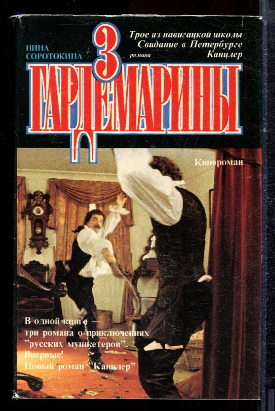 В книгу Нины Соротокиной ``Гардемарины`` вошли три романа: ``Трое из навигацкой школы``, ``Свидание в Петербурге`` и ``Канцлер``. Действие ``Гардемаринов`` происходит в XVIII веке, в эпоху царствования дочери Петра Елизаветы, когда в России уже появляется юная цесаревна, будущая императрица Екатерина Великая. В исторический роман вплетаются элементы романа приключенческого. Занимательно плетется интрига, в которой раскрываются характеры трех воспитанников навигацкой школы. Герои ищут свое место в жизни, свое счастье и следуют вечно благородному девизу: ``Жизнь — Отечеству, честь — никому!``. По романам были сняты многосерийные телевизионные фильмы.